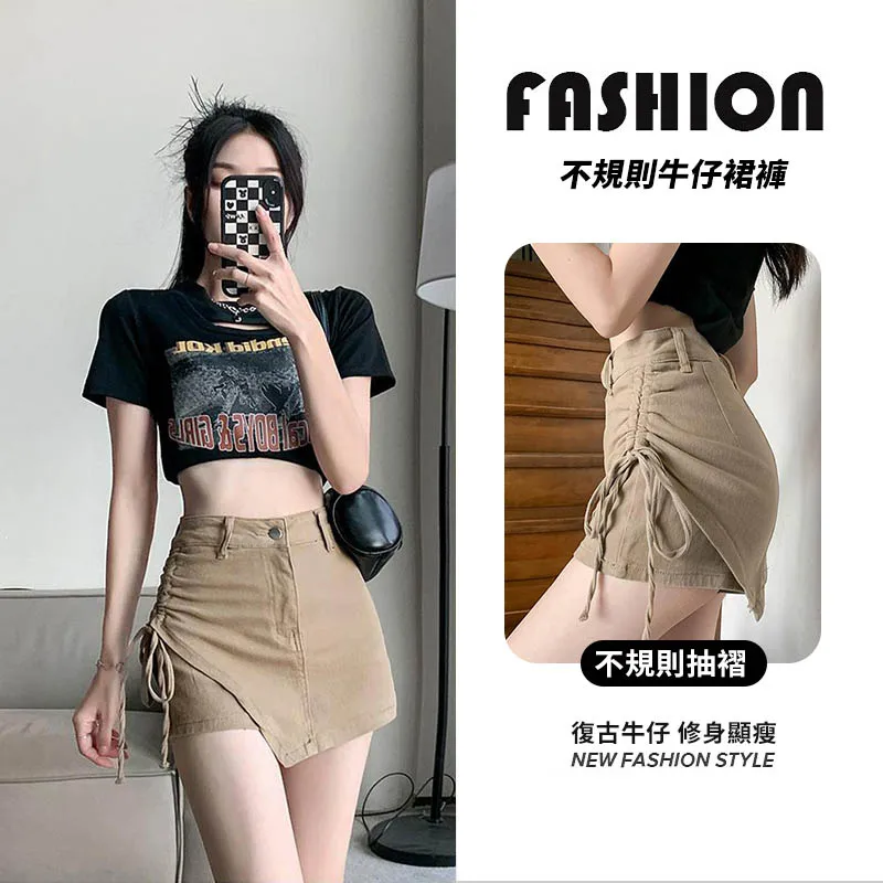 夏日韓版純色牛仔短裙,高腰顯瘦設計,小眾不規則剪裁